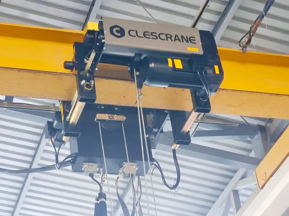 Clescrane ofrece un grúa viajera, con dos polipastos de cable,un SWL es 50t y otro SWL es 25t, levantando grandes moldes. Para ayudar a completar esta ardua tarea de procesamiento. Esta grúa puede operar dos polipastos en la grúa al mismo tiempo, e incluso puede usarlos al mismo tiempo en función de la forma y el tamaño de la carga a transportar. Durante la operación en serie, el polipasto se mueve en paralelo en la dirección del objetivo a la misma velocidad. Incluso la carga de cada gancho no es igual, la sincronización de elevación es efectiva. Esta función se basa en la ubicación conocida de los dos ganchos. La velocidad de elevación común de los ganchos está limitada en función de la velocidad de elevación más lenta.
