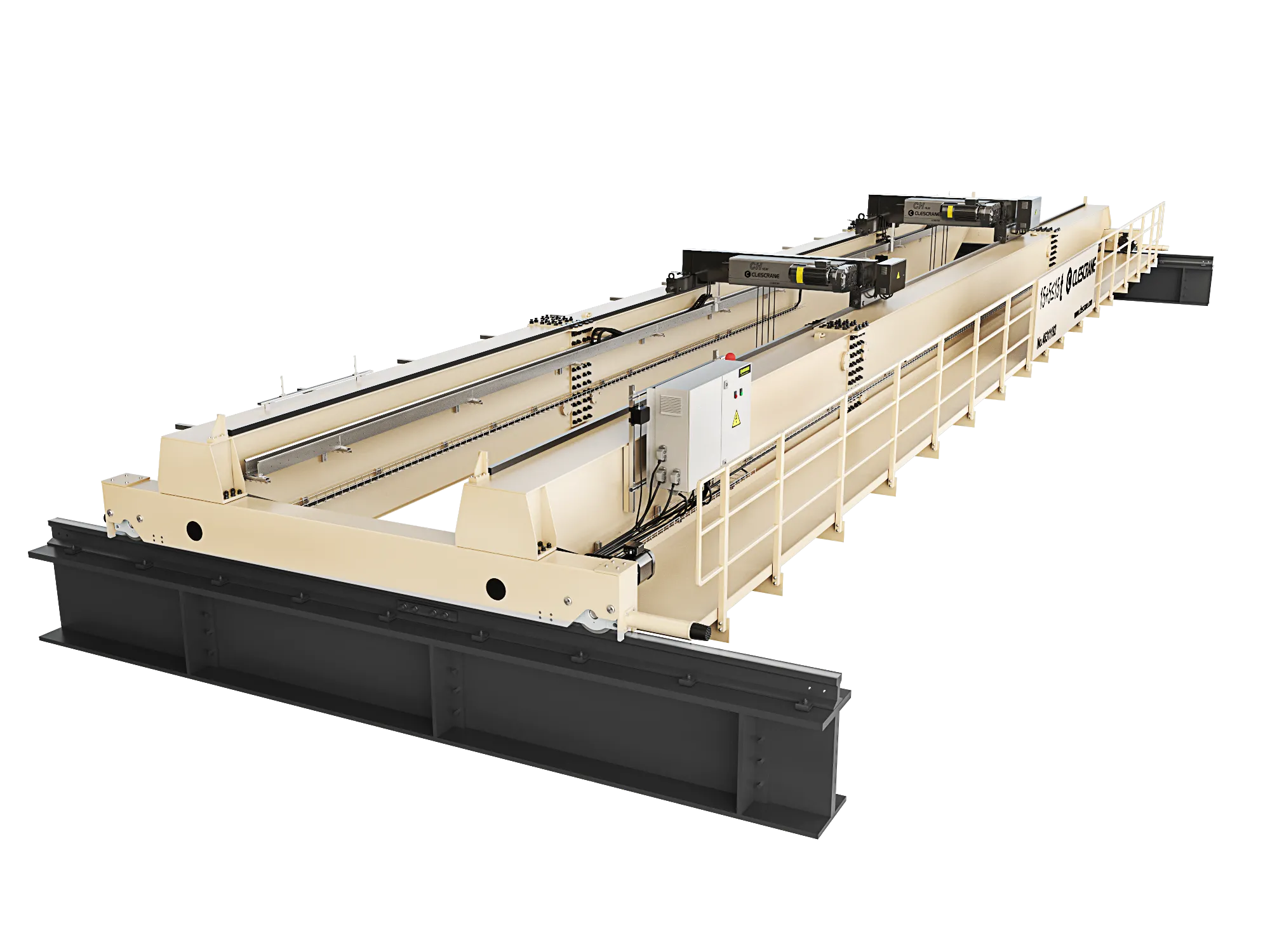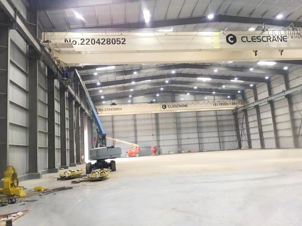 CLESCRANE puente grùa birrail de la serie CHD ofrecen una capacidad de carga excepcional con un peso propio reducido. Potentes y ágiles, con una capacidad de hasta 100 toneladas, son especialmente adecuadas para la fabricación en general, talleres y líneas de montaje. El gancho de carga se puede elevar entre las dos vigas de la grúa, lo que permite alcanzar grandes alturas de elevación.